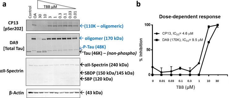 Tauopathies are a class of neurodegenerative disorders characterized by abnormal deposition of post-translationally modified tau protein in the human brain. Tauopathies are associated with Alzheimer's disease (AD), chronic traumatic encephalopathy (CTE), and other diseases. Hyperphosphorylation increases tau tendency to aggregate and form neurofibrillary tangles (NFT), a pathological hallmark of AD. In this study, okadaic acid (OA, 100 nM), a protein phosphatase 1/2A inhibitor, was treated for 24h in mouse neuroblastoma (N2a) and differentiated rat primary neuronal cortical cell cultures (CTX) to induce tau-hyperphosphorylation and oligomerization as a cell-based tauopathy model. Following the treatments, the effectiveness of different kinase inhibitors was assessed using the tauopathy-relevant tau antibodies through tau-immunoblotting, including the sites: pSer202/pThr205 (AT8), pThr181 (AT270), pSer202 (CP13), pSer396/pSer404 (PHF-1), and pThr231 (RZ3). OA-treated samples induced tau phosphorylation and oligomerization at all tested epitopes, forming a monomeric band (46-67 kDa) and oligomeric bands (170 kDa and 240 kDa). We found that TBB (a casein kinase II inhibitor), AR and LiCl (GSK-3 inhibitors), cyclosporin A (calcineurin inhibitor), and Saracatinib (Fyn kinase inhibitor) caused robust inhibition of OA-induced monomeric and oligomeric p-tau in both N2a and CTX culture. Additionally, a cyclin-dependent kinase 5 inhibitor (Roscovitine) and a calcium chelator (EGTA) showed contrasting results between the two neuronal cultures. This study provides a comprehensive view of potential drug candidates (TBB, CsA, AR, and Saracatinib), and their efficacy against tau hyperphosphorylation and oligomerization processes. These findings warrant further experimentation, possibly including animal models of tauopathies, which may provide a putative Neurotherapy for AD, CTE, and other forms of tauopathy-induced neurodegenerative diseases.