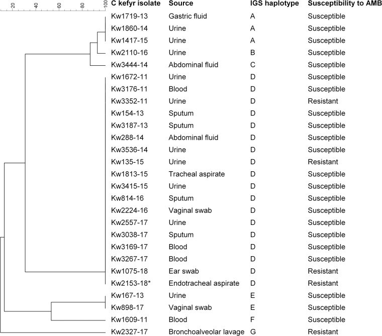 Methods: Clinical C. kefyr isolates recovered from bloodstream and other specimens during 2011 to 2018 were retrospectively analyzed. All C. kefyr isolates were identified by CHROMagar Candida, Vitek2 and PCR amplification of rDNA. AST was performed by Etest. Molecular basis of resistance to fluconazole and echinocandins was studied by PCR-sequencing of ERG11 and FKS1, respectively. Genotypic heterogeneity was determined with microsatellite-/minisatellite-based primers and for 27 selected isolates by PCR-sequencing of IGS1 region of rDNA.