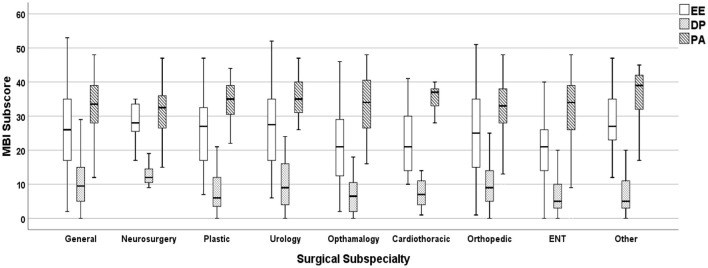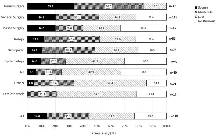 Results: Prevalence estimates for burnout and severe burnout were 76.9% (95% Confidence Interval = 72.9-80.7%) and 14.0% (11.0-17.5%), respectively. The prevalence estimates for high EE, high DP, and low PA scores were 44.7, 43.1, and 47.2%, respectively. The prevalence of burnout and severe burnout was highest among neurosurgeons. Burnout was lowest among otolaryngology surgeons and severe burnout was lowest among cardiothoracic surgeons. After adjustment, burnout was associated with younger age, lower income, and more on-calls per month. The four most common sources of stress included less family time, verbal assault, case overload, and highly complicated cases.